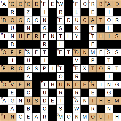 Special thanks today, PeeDee – I had to give up [having other urgent things to do] with the bottom half completed but entries in the top half being woefully sparse. It’s such a good puzzle that I wish I’d waited to come back to it later this afternoon.