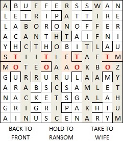 Between us, we stumbled on the fact that ZYTHUM was the last entry in the dictionary and A (“the unclued 1 across”) was the first, so we were dealing with an imaginary seven-volume reference work, the volumes present being A TO BACITRACIN, FRONTIER TO HOLARCTIC, RANT TO TAKAMAKA, and WIFFLE BALL TO ZYTHUM. Thus the volumes missing are BACK TO FRONT = REVERSED, HOLD TO RANSOM = BLACKMAIL, and TAKE TO WIFE = MARRY.