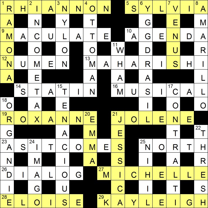 I got the primary theme from the names I had, but I didn’t spot the secondary one. I appreciated the way that for the most part one did not have to know about the pop scene to solve this. I knew WHAM, but I didn’t get AMARILLO because I don’t know Marillion. (I didn’t get Kayleigh either – what a strange name!)