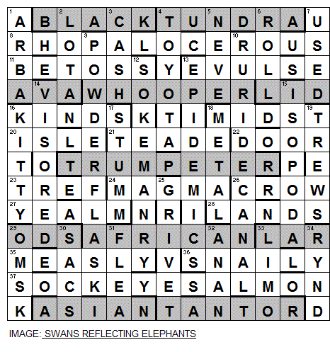 The remainder of the grid now fell into place. TRUMPETER was both a swan and an elephant, the top half of the grid had three swans (BLACK, TUNDRA and WHOOPER) and the bottom half had three reflected elephants, AFRICAN, ASIAN and TANTOR??