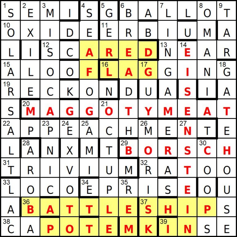 Although some of the early clues were slightly tricky, everything came together fairly quickly. The grid was nearly full when I could see Sergei EISENSTEIN trying to make himself known at 14dn, and I knew we had to be dealing with BATTLESHIP POTEMKIN, the only film of his that I have seen — I’m sure he made others. This has the famous baby in a pram trundling down the steps in Odessa, Ukraine. I needed to read up on the film (it’s at least forty years since I saw it) and found that Act I was entitled Men and Maggots and had the sailors complaining about the MAGGOTY MEAT in their BORSCH.