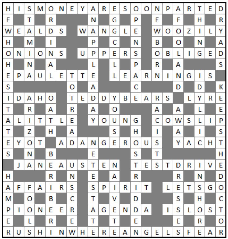 A jumbo crossword in the tradition of including long well-known phrases, that one suddenly recalls when a few crossing letters appear – no real need to unscramble the anagrams. All good fun.