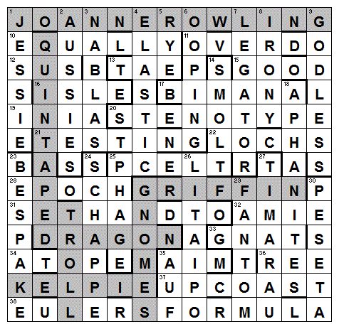 The usual profuse thanks to Shark and Hihoba. Tough clues, indeed, but this was one of the rare IQs where as light began to dawn I could hardly believe my luck – in 2006 I wrote a whole book on the Harry Potter phenomenon for Gollancz and still have a copy of Fantastic Beasts on the shelves. Which was just as well, since I’d forgotten QUINTAPED (first beast found in the grid) and ACROMANTULA.