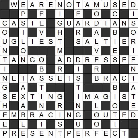 What a joy to solve. And as has been commented, the lady seems interested in grammar, so if Kathryn’s Dad is around (he’s a real stickler for it) he will be as happy as me.