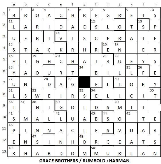 The last bit of the puzzle was to unjumble two rows and write some things below the grid. I was convinced that the two word phrase was going to be “I’m free” – the catch phrase regularly employed by HUMPHRIES but, of course, that is far too short to occupy an entire row. As it turns out, the first row can be arranged to make GRACE BROTHERS – the two word phrase (being the name of the department store) and the bottom row can be arranged to make RUMBOLD HARMAN – two further characters from the show.