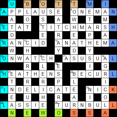 Sorry to be parochial, but I did like that the Aussies got a look-in. I got TURNBULL at 26a fairly easily, but then I was convinced that 8a must include PELL as the Australian (top cleric George Pell, our man in Rome, though currently back in Australia to face the music). That sent me up a very dry gully looking for a Classic FM presenter named Charlotte Spelling. Once I got 3d OUSTED, I had to rethink that entirely.