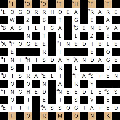 4. Missed the top row of the Nina – at least the FOR MONK bit is now explained. Most went in reasonably smoothly though I couldn’t parse a few such as FRENZIED. The Nina helped in the SW corner where I was stuck for a while. I thought E-FIT was an excellent cryptic def and was my last in.