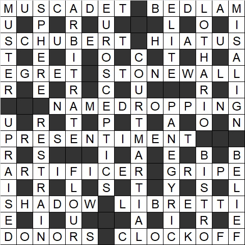 There are some neat touches – Bruch ‘set out’ to become SCHUBERT at 9A. Piers Morgan NAME-DROPPING at 14A, like the fawning sycophant he is. The ARTIFICER at 21A ‘crafting’ intricately. 1D was clever – I didn’t note a LOI on my working copy, but this may have been it.