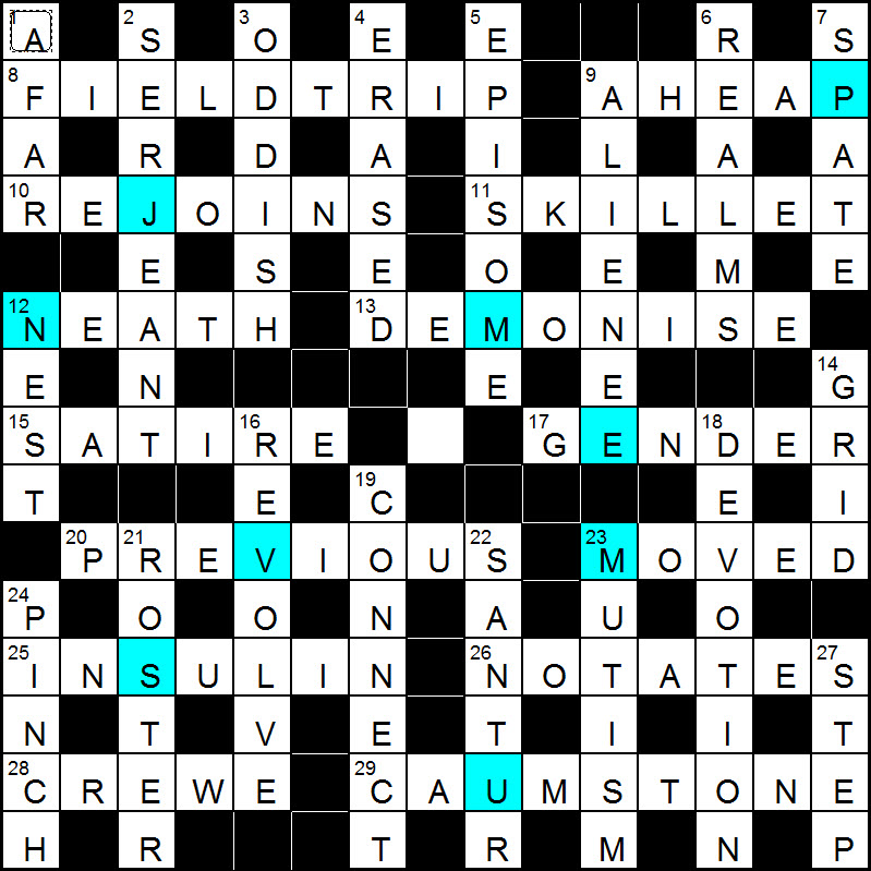 This was an enjoyable puzzle where I started quickly and then slowed down a bit in the middle before speeding up again towards the end of the grid fill. It took a little while to crack the end game but it was very satisfying when the penny dropped.