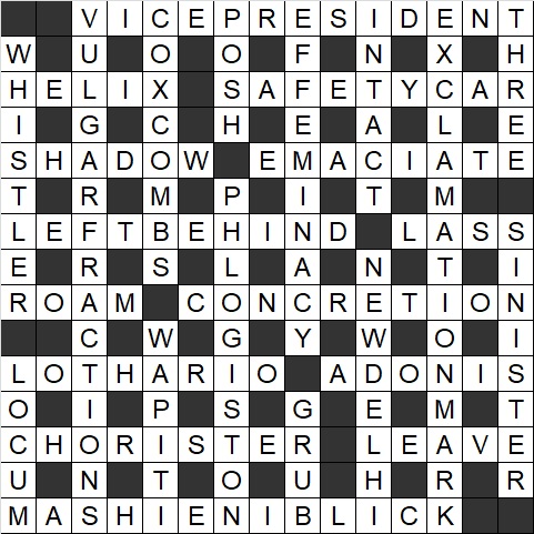 A two-day job for us, Saturday out of reach of any help and Sunday requiring much help, with several ‘Doh!’ moments, e.g the THREE/POSH cross-reference, EXCLAMATION MARK and LASS. We did LOTHARIO from crossing letters but coudn’t parse it having never come across the old meaning of ‘loth’.