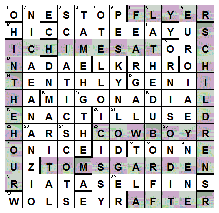 7. I got off at a flying start with a lucky guess of AFTER MIDNIGHT in the bottom right corner, though I knew this as a film not a song. I hunted around for a few other likely midnights and started finding them all over the place, the diagonal soon followed. The TS Eliot reference was also familiar though I couldn’t have quoted it verbatim. On film, books and poetry I’m on safe ground. After a long run of DNFs I’m back on a winning streak again! Very pleasing. Thanks to Dysart and Hihoba.