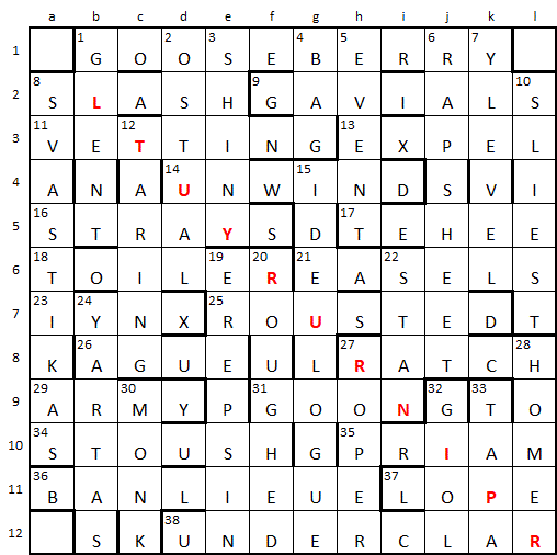 I pondered it the next day and out of the blue, it struck me. If two is company then three’s a crowd. If we insert yet a third letter into each cell in the diagonal, we create more new words, which are valid for both across and down answers. And that brings us back nicely to GOOSEBERRY.