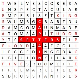 Google led me to the Red Cross as the relevant Nobel prize winners, so we need to highlight those last two entries in RED – the grid was complete but there were a few loose ends to tidy up. Red Setters was immediate, quickly followed by Captain Scarlet, so now on to the thematic (red) associations of those answers each of which traverses (crosses) the grid. I think that the order I got them was Ruby Tuesday, Pink Floyd, Tudor Rose, King Crimson, Cherry Pickers, and, after five minutes of head-scratching, Maroon 5.