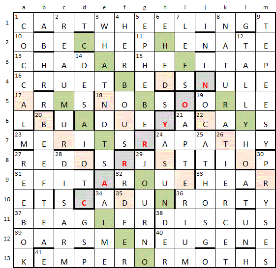 The only minor hiccup was not quite knowing what to put in the barred off cells. CARRY ON looked a likely candidate but which way? Then it struck me that filling it in SW-NE allowed seven more CARRY ON titles to be filled. These being (from bottom to top) CLEO, ABROAD, MATRON, NURSE, CABBY, DOCTOR, HENRY.