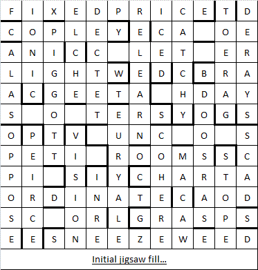 The jigsaw was still empty at this point, but my candidate word lists were filling up – too many 5s and 6s to see any obvious starting points, but only four each of 3s, 4s and 8s (I didn’t get the two 10s until right near the end!)
