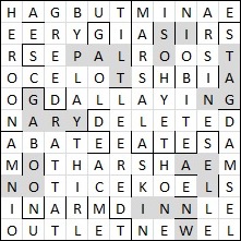 So, all done apart the doubling up with those S’s. First thing to note – there were exactly seven S’s left in the grid. (There are 8 S’s in SHE SELLS SEA SHELLS ON THE SEA SHORE, but the grid’s central cell will contain the start of both SEA’s.) Initially there was some choice as to which cells to use for the doubled-up letters – for example we could have [SH]E [SE]L[LS] or [SH][E S]EL[LS] – but the preamble says share … cells, none containing a side that borders a hole, and amazingly (?) that resolves all ambiguity.