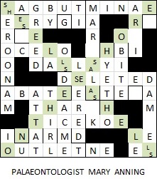 I eventually spotted Mary Anning by shuffling the pieces around to try and make a coherent word or two, but it still took a nudge from Terrier to realise that the remaining letters would make an occupation (I had mistakenly assumed that the three word identity would include a title or be a three part name). Completing that part of the process then allowed me to return to the grid to fill in some remaining gaps in the bottom left.