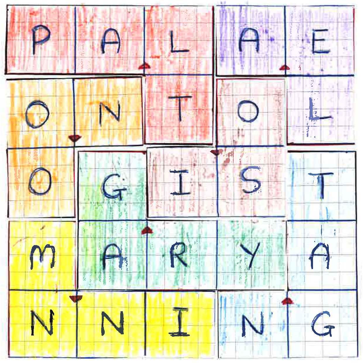 Monday came and went with no time for more fiddling, same on Tuesday, but I skipped my usual lunch with colleagues next day and decided to tackle phase 3: move seven letters … After a short while I noticed that the SW-NE diagonal read ON THE EA HORE, which could become ON THE SEA SHORE with the addition of two S’s. About the same time I put two of the shapes together (one rotated) to give M-ARY_ NNI__, so I Googled “mary on the sea shore” and, hey presto, up popped Mary Anning, fossil collector. Back to the shapes, and PALAE ONT.L O. etc was appearing, and going back to the grid I saw that the NW-SE could be converted from HEELLEAHELL to SHE SELLS SEA SHELLS with the addition of some more S’s.