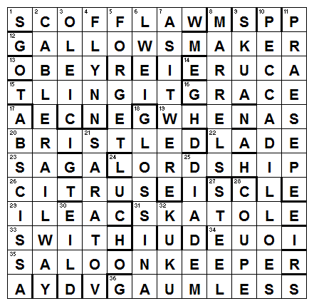 | 12A | look fierce | GLOWER | GALLOWS-MAKER | 23A | someone behind hanging |