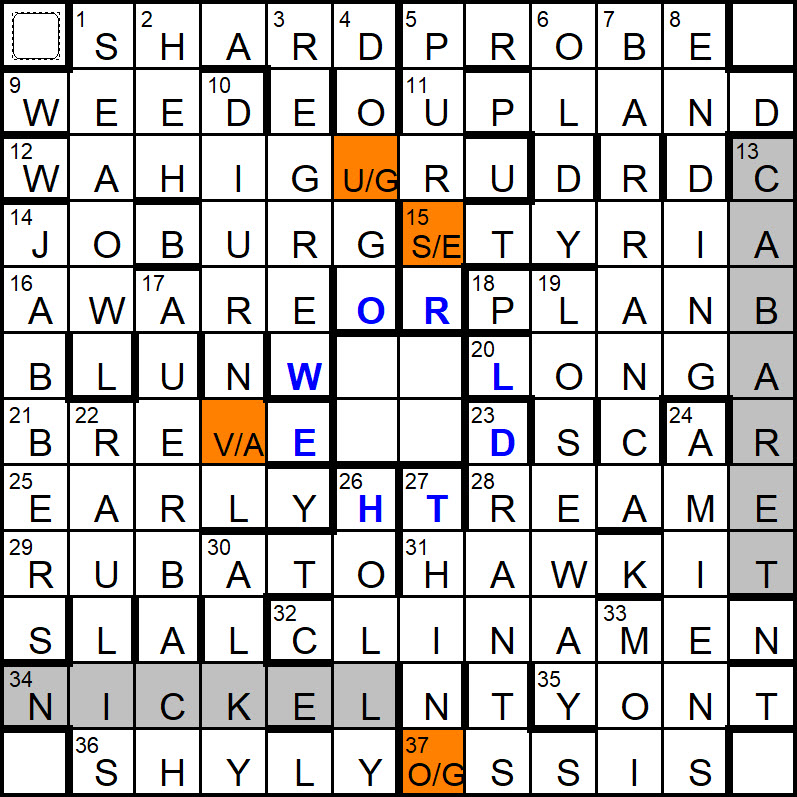 This was a hard but very enjoyable puzzle, that kept me occupied off and on for two or three days. Thanks to Shark for the entertainment and grid construction.