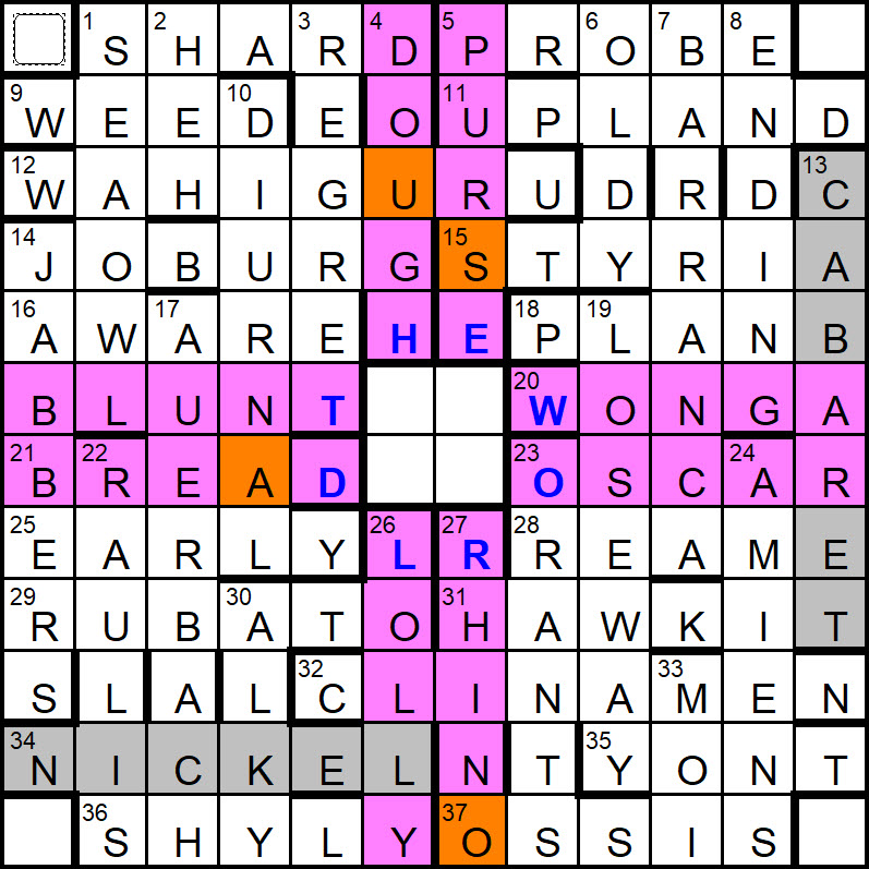 The preamble seemed to hint that we would looking for the name of a poem or a play or a musical at 13 down and CABARET looked a good choice fairly early on. For some reason I thought 34 across was unclued and I didn’t notice until late on that it was clued. With the crossing letters I had, NICKEL was pretty clear and at that point the line MONEY MAKES THE WORLD GO AROUND came to mind That wasn’t a great help initially as I was looking for words that would use the letters that obviously couldn’t be changed in the clashes. For instance, the U of WAHIGURU was going to stay, as was the A of DIURNAL and the O of OSSIS as well. I came up with BREAK, DOUGH and RHINO . I reckoned the eight words to be highlighted were going to be the eight five letter ‘words’ beginning or ending on the large blank square in the centre. I say ‘words’ as two of them involved crossing vertical bars.. I could see that ‘BLUNT‘ would fit with REGRET and OSCAR would fit with ORANTS. Then the inspiration came as I realised BREAK could be BREAD which has a monetary connotation, as do DOUGH and RHINO. A trawl through the dictionary came up with money associations for BLUNT and OSCAR.. We could have PURSE at 5 down to keep STYRIA intact and LONGA could go safely to WONGA and HOLLY could go to LOLLY to give us eight symmetrical money words.