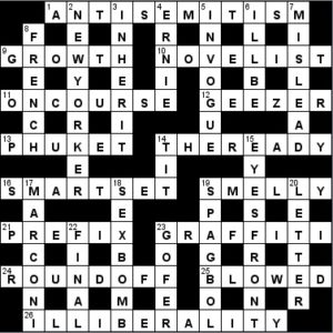 1 | ANTI-SEMITISM | Narrow-minded feature of Corbyn’s party intimates, hopelesss, drained of energy around the House (4-8) (INTIMATES – E)* AInd: hopeless, giving ANTITISM, around SEMI (house). Slightly confused by the triple s in hopelesss but it looks like that is simply a typo. First one in. I’m afraid this was a virtual write-in for me from the very clear definition of a news-line that’s been relentlessly pushed over the last few weeks. |