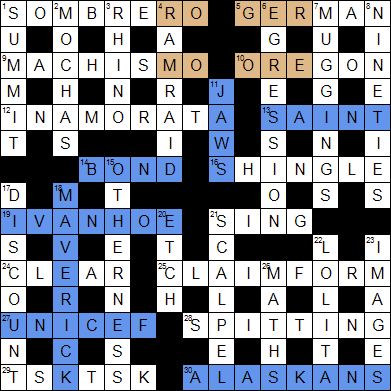 Thanks to Gaff and PeeDee. I’m another who missed the preamble and did not get BOND or RAM-RAID, UNICEF, and MACHISMO (and chose spotting, not SPITTING). I parsed NINETIES but needed help understanding it. Not a good outing.