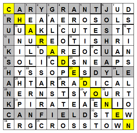 Charade concerns BRIAN CRUIKSHANK played by CARY GRANT (the top across unclued entry), who has three aliases, PETER JOSHUA, ALEXANDER DYLE and ADAM CANFIELD, which fit nicely into the vacant spots in the grid. Cary Grant’s real name was ARCHIBALD LEACH, (no wonder he changed it!), which was spelled out by the corrected misprints, several of which I had to reverse engineer. These included the I in 26A (hadn’t heard of a yippie) and the B in 31A (a nice definition once you got it).
