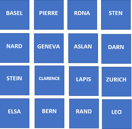 The third group is a set of well known towns in Switzerland – BERN, BASEL, GENEVA and ZURICH