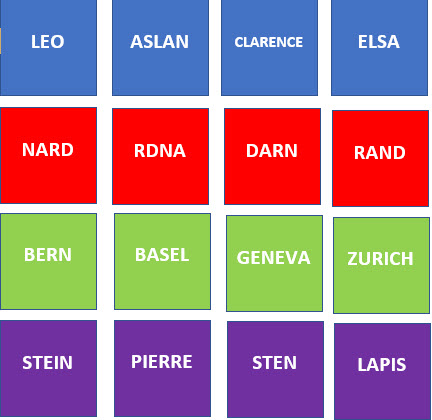 The first group of four that became contenders for the wall were four letter entries that were anagrams of ADNR and that helped identify clues with missing letters.  The Swiss towns group also became apparent after ZURICH and BASEL were solved.  The next group to fall were the lions.  The group that gave me the most difficulty were the rock or stones set and I’m still not entirely sure about the link with STEN
