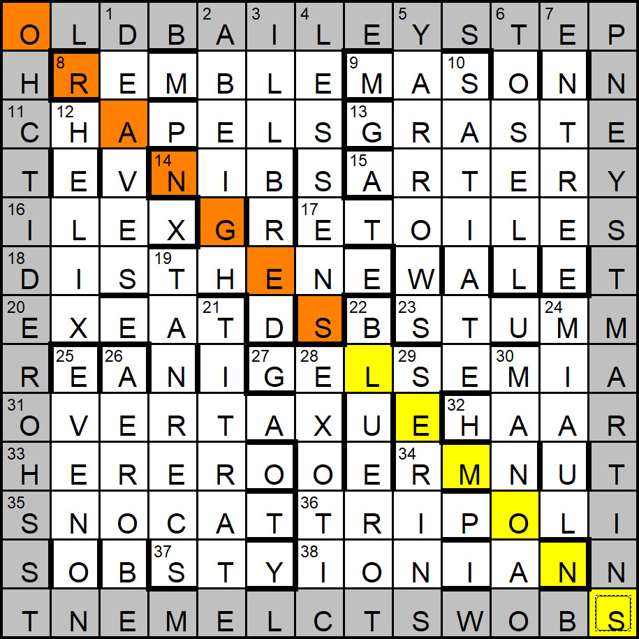 For a while I had the wrong superfluous words wrong . In the end they resolved as SALLY [word 4] in the clue leading to CHAPEL, giving us a P. The other three are shown in detail in the blog table below and yielded E, A and L to give PEAL, which is what BELLS do. The term ‘changes’ in the preamble also relates to BELL-ringing. The homophone PEEL, of course, is relevant to ORANGES and LEMONS. Both of these words can be found on the main left to right diagonal in the grid and should be highlighted. PEEL is a loose covering of fruit [sometimes a tight covering leading to me spraying juice all over the room]