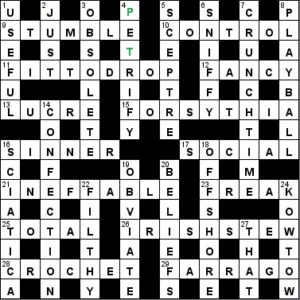 FORSYTHIA was a special answer for me, as it was the answer to the first clue in the first crossword I ever had published (as Sphinx in the British Go Journal). Although I also started with a Brucie reference (using “Good game!” in the clue somehow), I thought that might be unfair on large sections of my (tiny) of solvership, so it became: