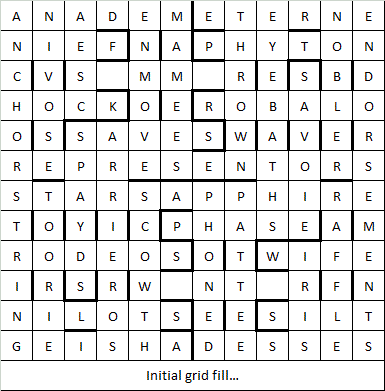 After a few passes through I started to gain some traction with grid-fill, crossers for the unclueds, and also some formative bits of the phrase made from the extra letters.