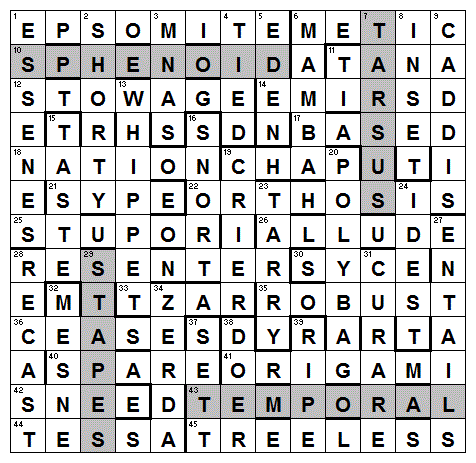 I had TARSUS at 7D, but hadn’t managed to parse the clue. The tarsus is a BONE, and the clue was easily parsed once I realised that there was no definition. I started looking for three more bones and located 29D STAPES, followed by 10A SPHENOID. The last to fall was TEMPORAL at 43A where I struggled with “Satisfied about” = TEM for a while. The bones were symmetrically placed in the symmetrical grid – a nice touch.