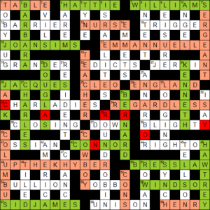 Much preferred this to the Guardian’s offering. Didn’t finish though, failing on a few in the bottom left, namely COLUMBUS, BULLION & COWBOY. Ok, I could have looked up carry on films and found 2 of these and, presumably, then finished.
