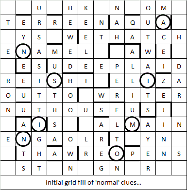 “The perimeter must be completed with a quotation that relates to a SOUGHT-AFTER STATE and its author (initial and surname); this explains how six answers must be treated on entry. Letters in the ringed cells can be rearranged to give a relevant word, which must be written beneath the grid. Unchecked perimeter letters could give PEOPLE START BIKES. Chambers Dictionary (2016) is recommended; one answer can be found in the Oxford Dictionary of English.”