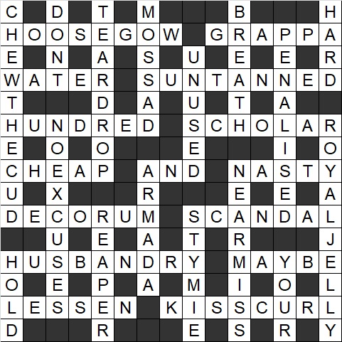 8A | GRAPPA | Good bang, old man? That’s the spirit (6) | spirit (Italian brandy) / G (good) + RAP (ban) + PA (old man, father) |