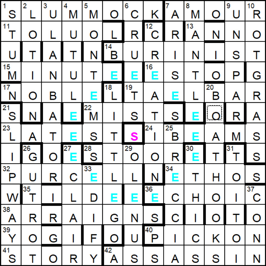 Filled the grid bar three in the bottom right, then ran out of time and didn’t google the very unpromising looking letters. So it’s wonderful to see now just how intricate the construction really was. Can’t believe in retrospect I didn’t spot the pattern the rescheduled ‘e’s were making in the grid.