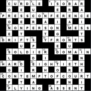 It took all the crossing letters to get both these. 22 Eightieth purely from the crossing letters it couldn’t be anything else. And as for 18 Domain, I kicked myself when I saw the wordplay “Do Ma in” because I’m sure I’ve seen that before. [Later: yes Tees in the Independent last August https://www.fifteensquared.net/2018/08/13/independent-9932-by-tees/ ]