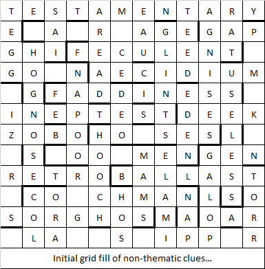 The purists/masochists might bemoan the (slight) asymmetry of the barring, obviously necessary to fit the thematic material, and/or the empty cells/non-words…either/both of which might have been obviated by some more devious setting/clueing/barring, and/or maybe a bigger grid? But as an ‘entry-level’ EV this feels just about right – although I might draw the line at four uses of the same clue type – 5-letter word stripped of outer letters to give a 3-letter word: C-ORA-L, B-OAR-D, O-DEO-N and A-GEN-T!