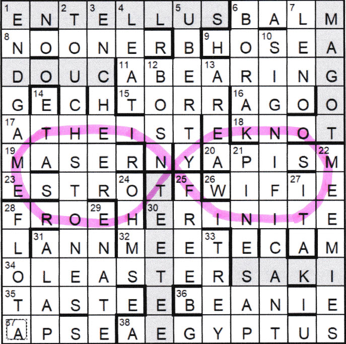 Again it was seeing MONKEY that triggered the final thought process to dredge up the theory that one an infinite number of monkeys with an infinite number of typewriters would eventually bash out the works of Shakespeare.   The message spelt out by the extra ;etters, of course, was a part of a Shakespeare work.  Playing about with routes through the letters I got MONKEY THEOREM and the rest fell into place after adjusting BOSS to BOS’N (which did fit the clue).  The full phrase THE INFINITE MONKEY THEOREM (24 letters) starts at the first T of ATHEIST in 17  cross and finishes on the M of ENDGAME at 1 down.  To finish off a well integrated theme, the phrase is spelled out in the shape of the mathematical symbol for infinity.