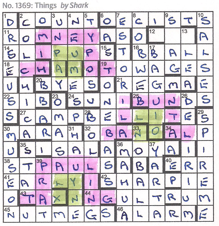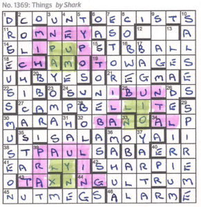 Two clues comprising two definitions each, but otherwise ordinary. Apart from 2 unclued entries – the across one of which has something to do with the double definition clues. No indication as to what the unclued down clue is! Then some cryptic representations to find (2×2 blocks) followed by 3 ten letter words. I must admit I tend to have difficulty getting onto Shark’s wavelength.