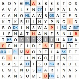 Sunday morning proved more fruitful starting with 2d OVATOR & 3d YANK, so I had a quick peek back at 1a which gave me BOY-GIRL, which also wouldn’t fit. But 4d GLORIA showed me that IRL was to be scrunched into the last (unchecked) cell of 1a … then revisiting my two other across answers and looking to scrunch two letters into an unchecked cell gave me THROB and LASKET, thereby confirming my suspicions that the ”thematic set” consisted of the IVR codes of European/EU countries; and, yes, we are talking BREXIT here. (And the central portion of the middle row, with all those unchecked cells, seemed to be a prime location for the final highlighting.)
