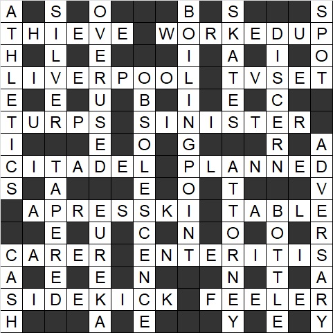 | 8A | WORKED UP | Balls hoisted after Labour gets excited (6,2) | excited / WORK (labour) + ED (Ed Balls, former Labour politician) + UP (hoisted) |