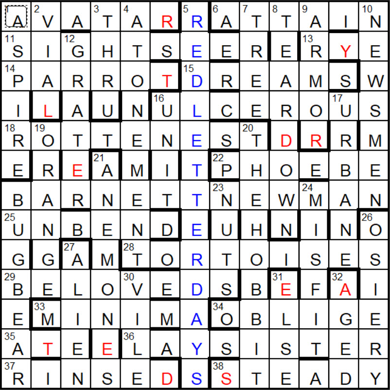 I got off to a good start with AVATAR, SIGHTSEER, PARROT and VIAL which also helped identify three of the omitted letters The 13 letter down clue also fell quick as RED-LETTER DAYS (this is the phrase in Collins, but not in Chambers)