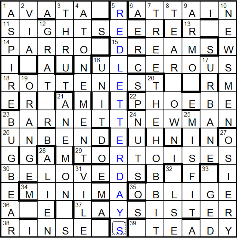I like catre-blanche gids and don’t usually have any trouble placing the words. I am not good at cold-solving so there has to be a few easier clues to get me started, and fortunately there were. I found BARNETT NEWMAN across the middle but had no idea who or what he was. Wikipedia explained everything and the final grid was very satisfying, I had used blue pen to fill the grid so I skipped the shading.