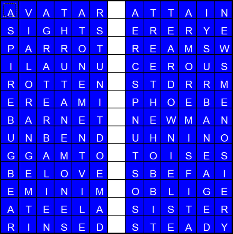 In the unclued central row, the name BARNETT NEWMAN could be seen. This was not a name that was known to me, so some research was required. It didn’t take long to track him down as an American artist of some note who painted a series of works entitled ONEMENT I to ONEMENT VI. The latter of these can be seen spelled out in column 5 of the grid. A bit more digging showed that the painting was two blocks of blue separated by a vertical white line. By redistributing the letters in the central column we have produced the vertical white line. The painting sold in 2013 for $43.8 million. The images below show how the final grid was developed through various stages.