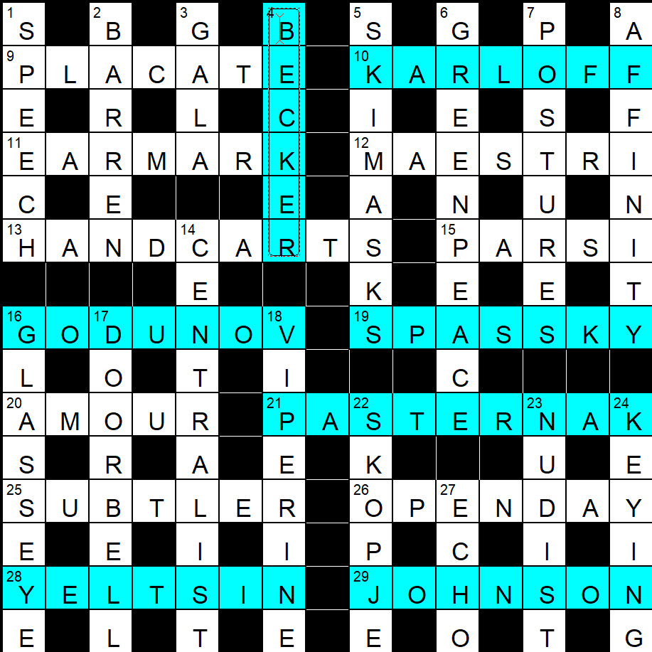 The penny dropped with GODUNOV at 16 across and BORIS came to mind. I then wrote down a few BORIS‘s with PASTERNAK and BECKER being front runners. I tracked them down in the grid. With a few more crossing letters, SPASSKY and KARLOFF became apparent.