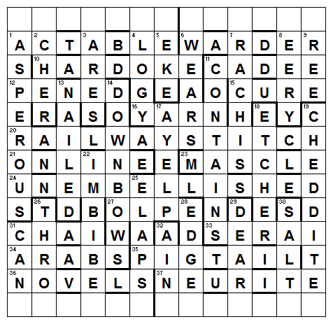 I was able to solve most of the normal clues quite quickly, but found the extra letters quite hard to find. I struggled with some of the parsing initially, particularly with 1A, ACTABLE, which seems so obvious now! I’m still not sure about HARDOKE though. I had NEURONE instead of NEURITE which held me up for a while, but I soon had most of the grid filled.