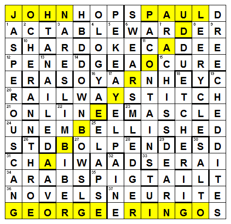 It was easy from there. Abbey Road is the Beatles penultimate album with the famous cover of the four on the Abbey Road pedestrian crossing. We were clearly going to enter JOHN, PAUL, GEORGE and RINGO in the blank squares. The names make a total of 19 letters, so the extra 7 (DESHOPS) made up the 26 required for two rows of the 13×13 grid. ABBEY ROAD is 9 letters, making up the 28 to be highlighted according to the rubric.